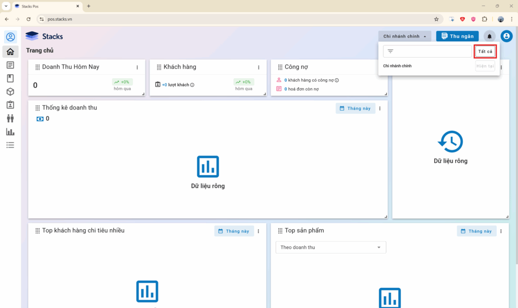 Bước 1: Ở giao quản lý, chọn nút “Chi nhánh chính” ở góc phải màn hình và chọn “Tất cả”