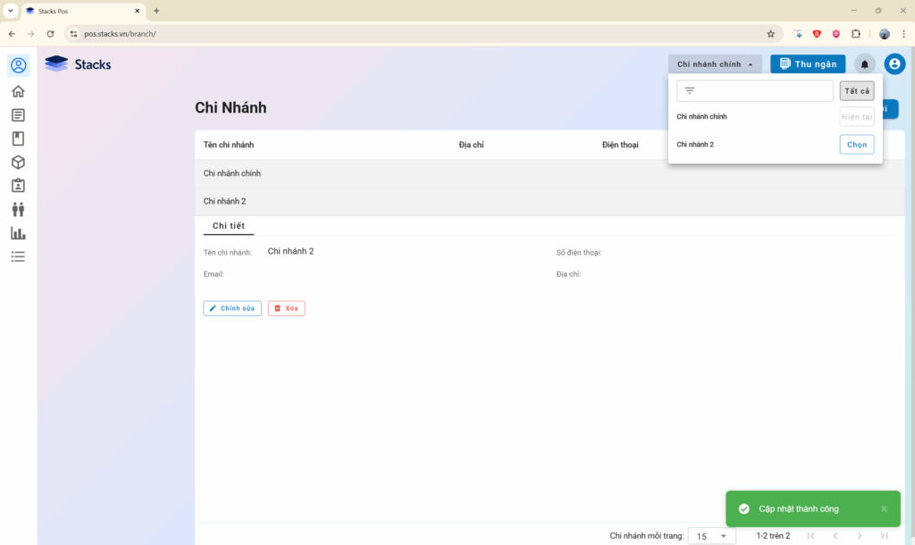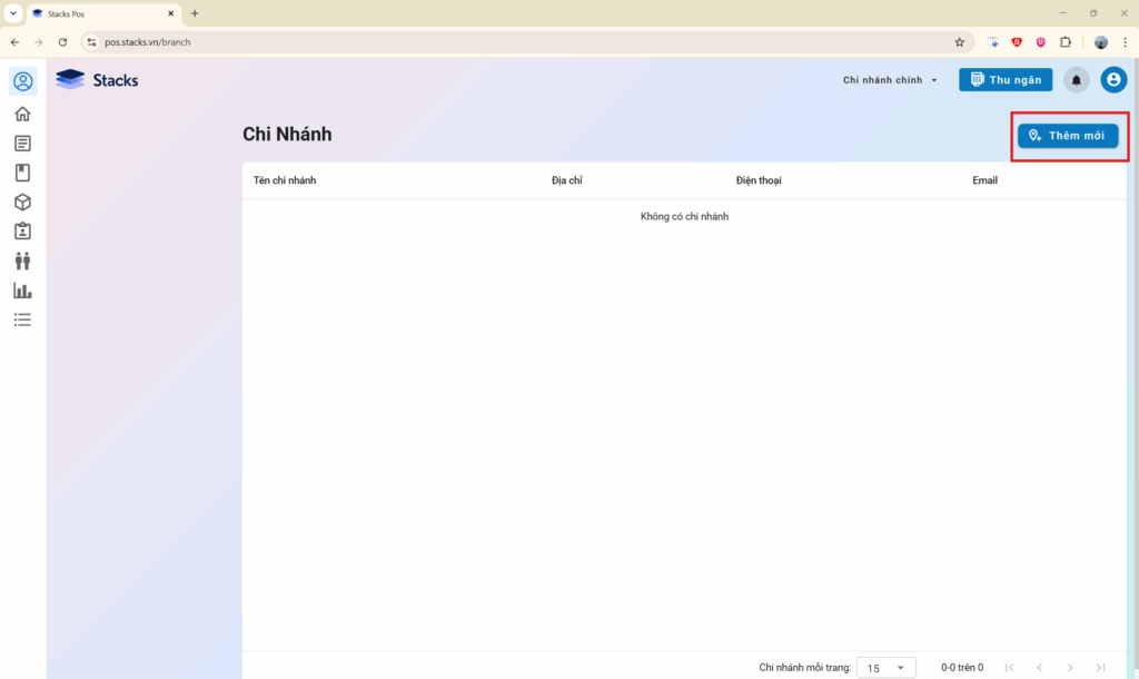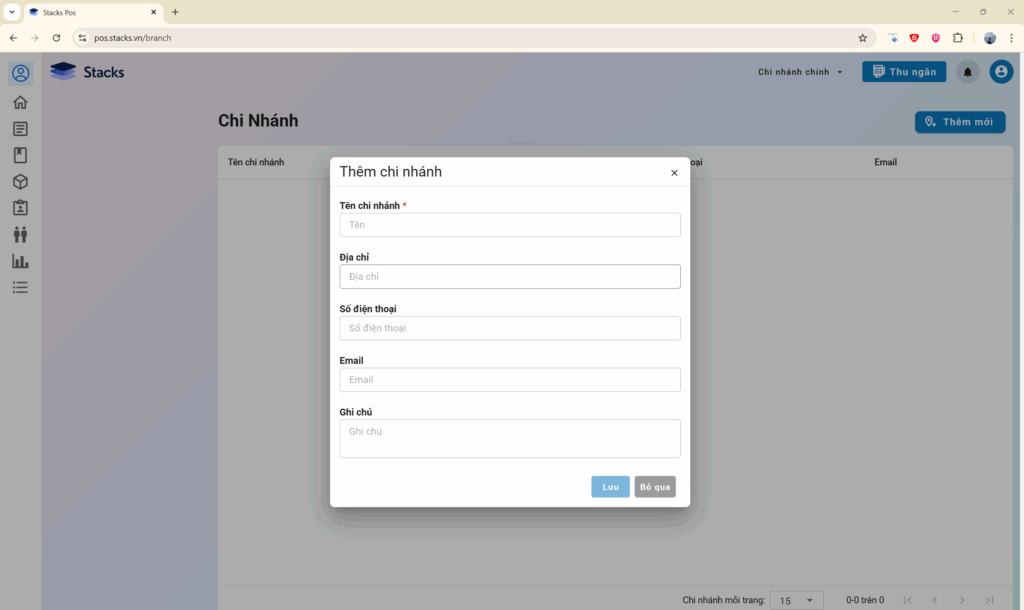 Để thực hiện thêm mới chi nhánh trên phần mềm Quản lý bán hàng STACKS, bạn thực hiện theo các bước sau: