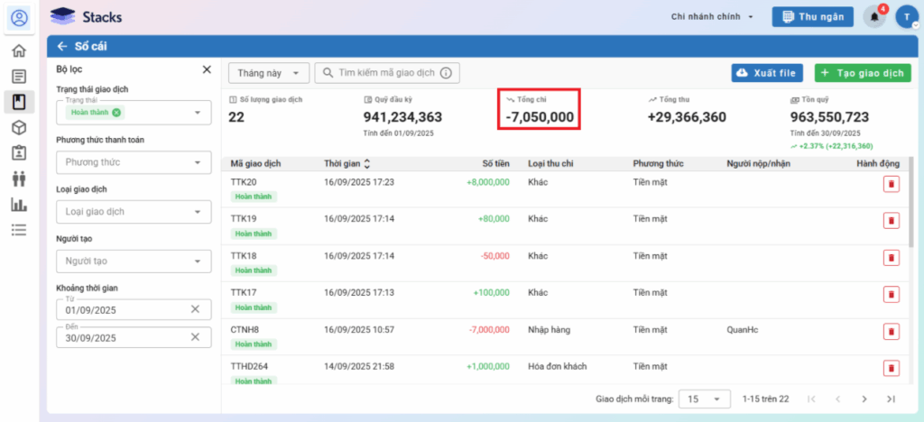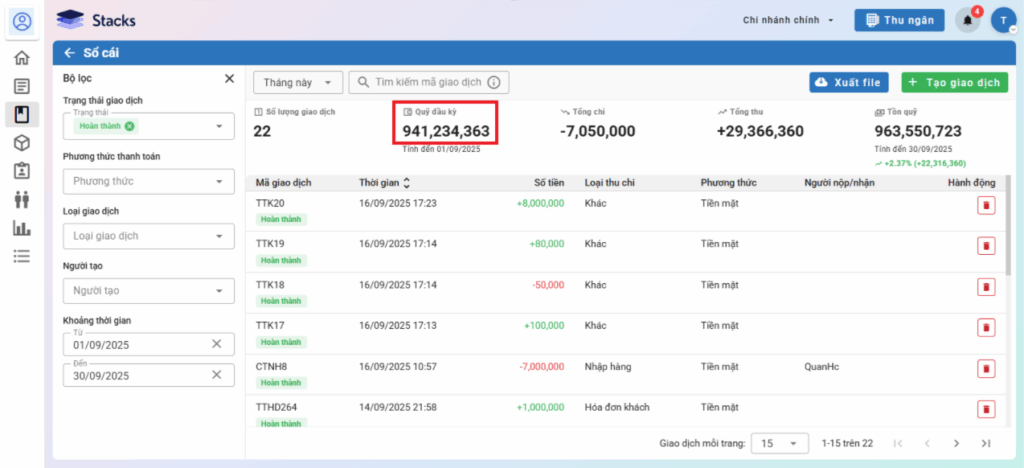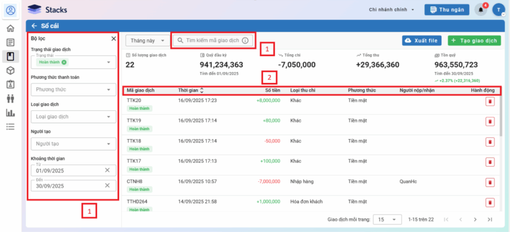 – Trên menu Sổ thu chi, hệ thống hiển thị danh sách phiếu thu/chi, bạn có thể tìm kiếm, hoặc sắp xếp danh sách