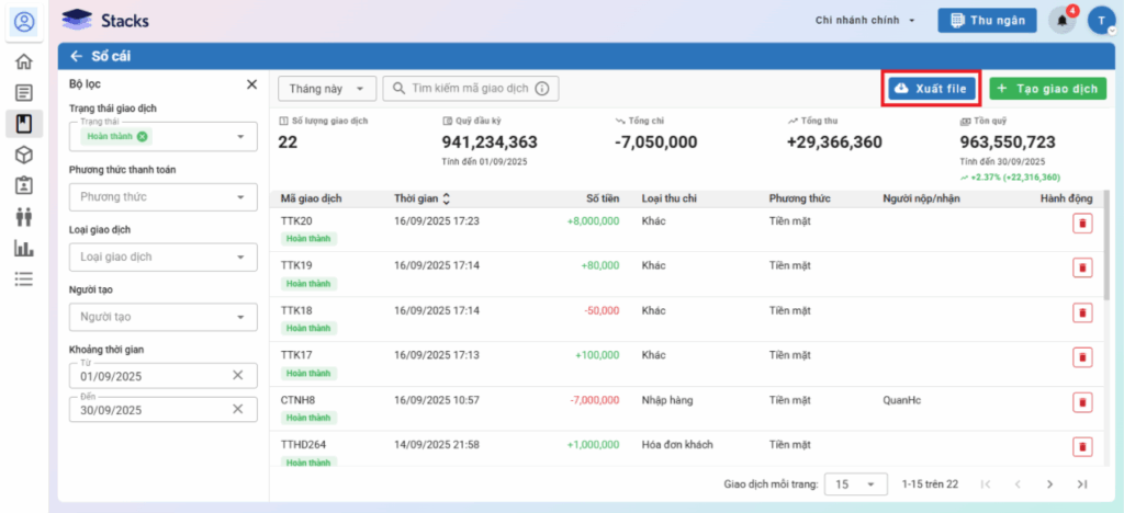 – Để xuất file sổ quỹ ra excel, bạn kích chọn Xuất file
