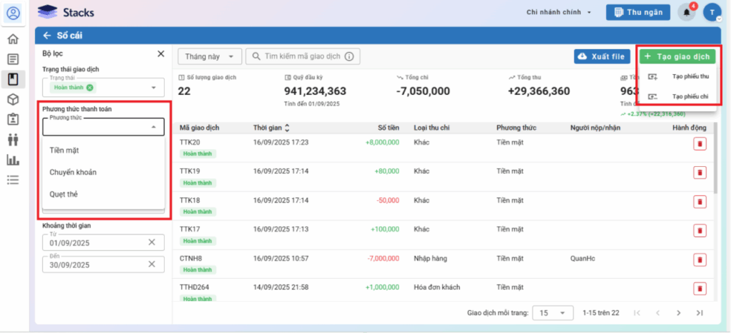 – Để tạo phiếu thu/ chi tiền mặt hoặc thu/chi trong tài khoản ngân hàng, bạn chọn nút + Tạo phiếu thu/ Tạo phiếu chi tương ứng với phương thức thanh toán Tiền mặt và Chuyển khoản