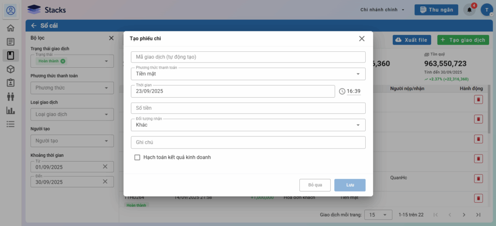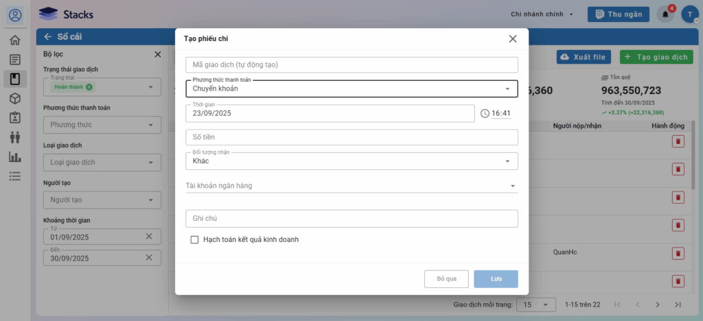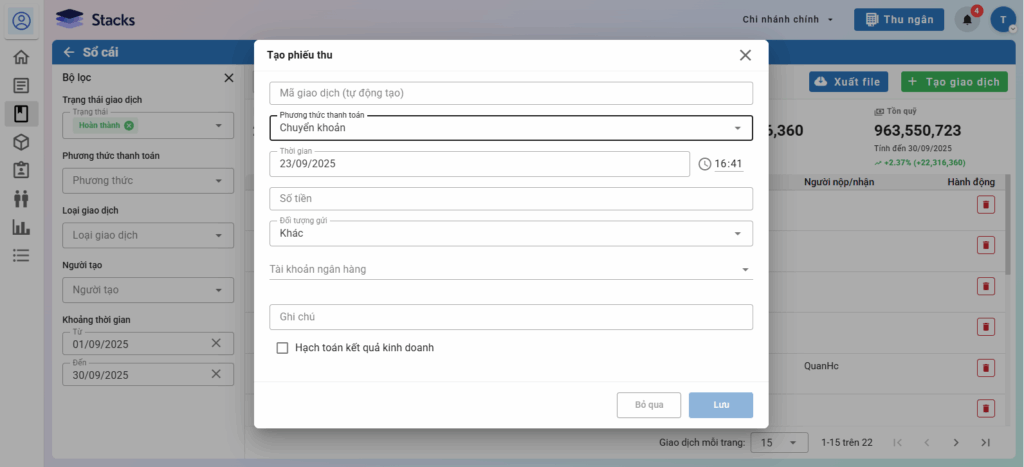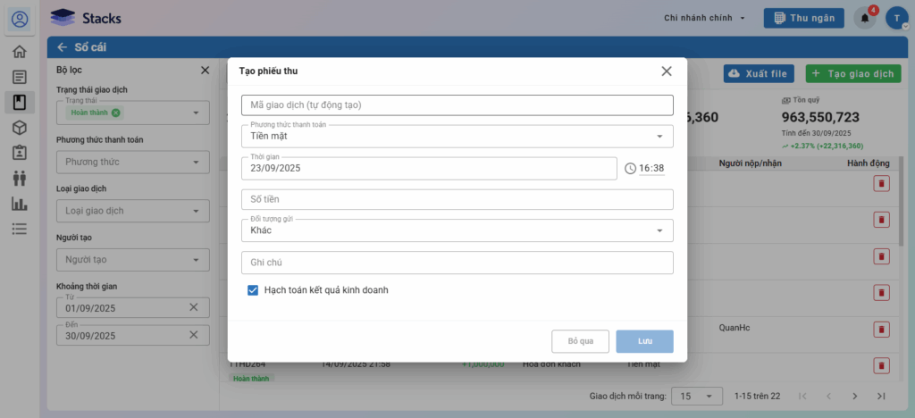 - Ghi chú: Ghi chú phát sinh khoản tiền thu/chi